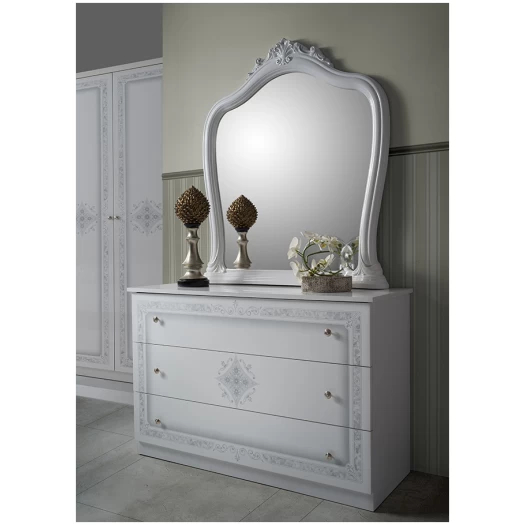 Comoda cu oglindă întărește imaginea luxoasă a încăperii și atrage atenția prin detaliile sale rafinate. Stilul său contemporan și liniile sobre vor oferi prospețime dormitorului tău! Comoda îți permite să depozitezi toate textilele, ținându-le departe de praf sau murdărie. De asemenea, oglinda încorporată îți permite să utilizezi comoda și pe post de măsuță de machiaj, scutind astfel o cheltuială în plus.
